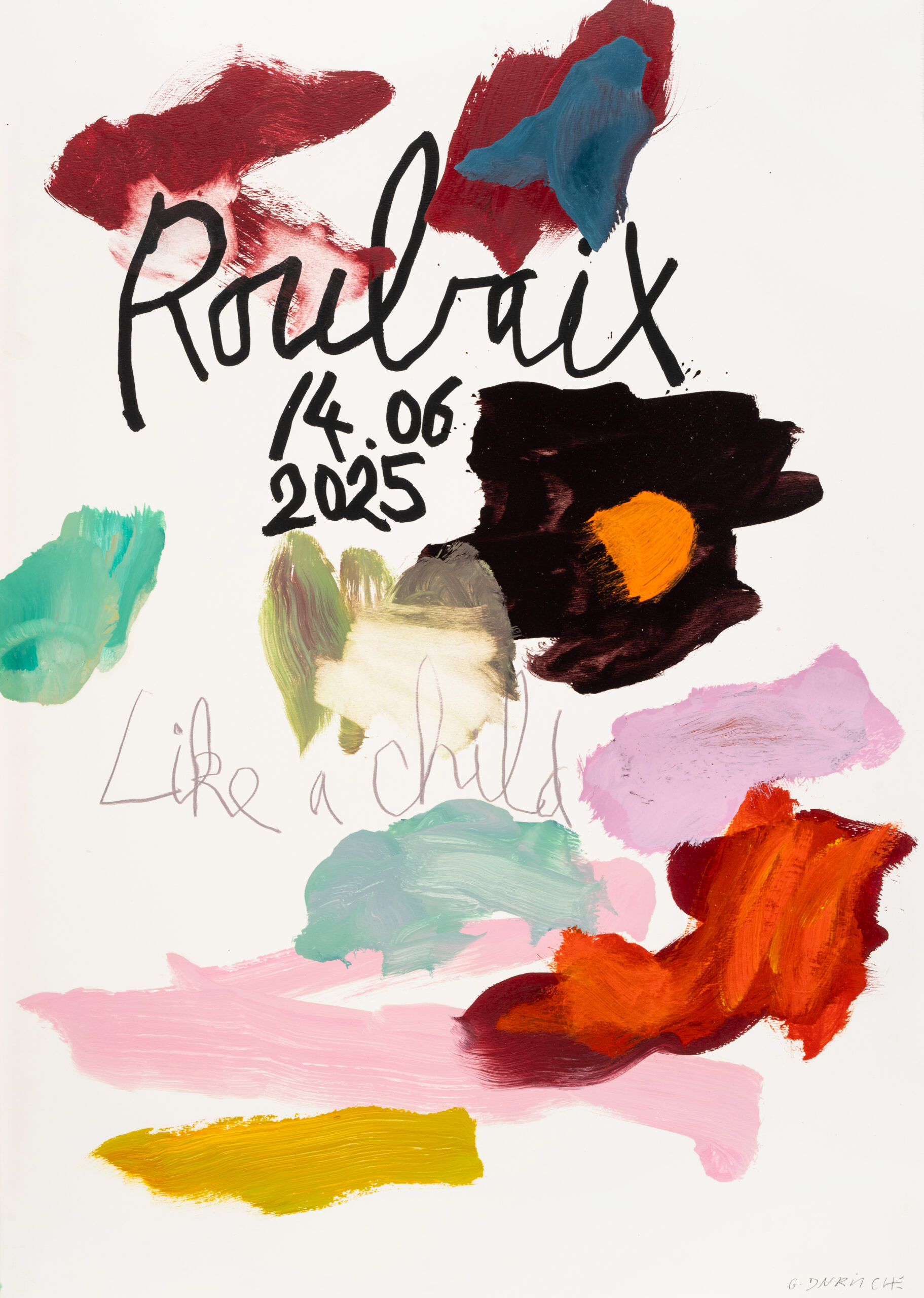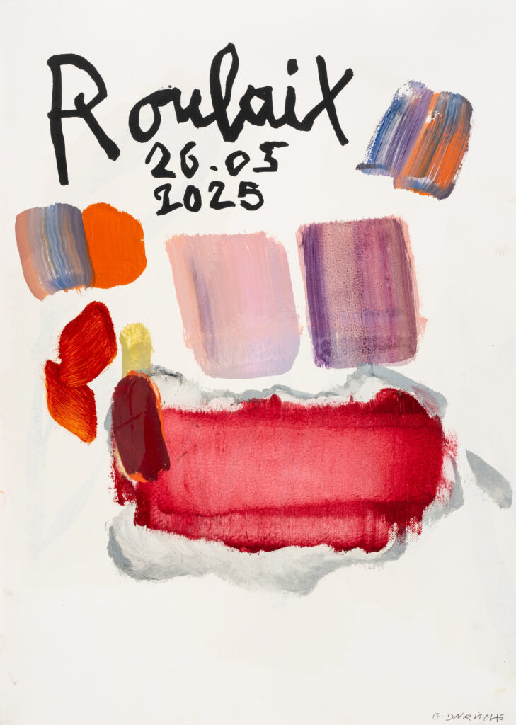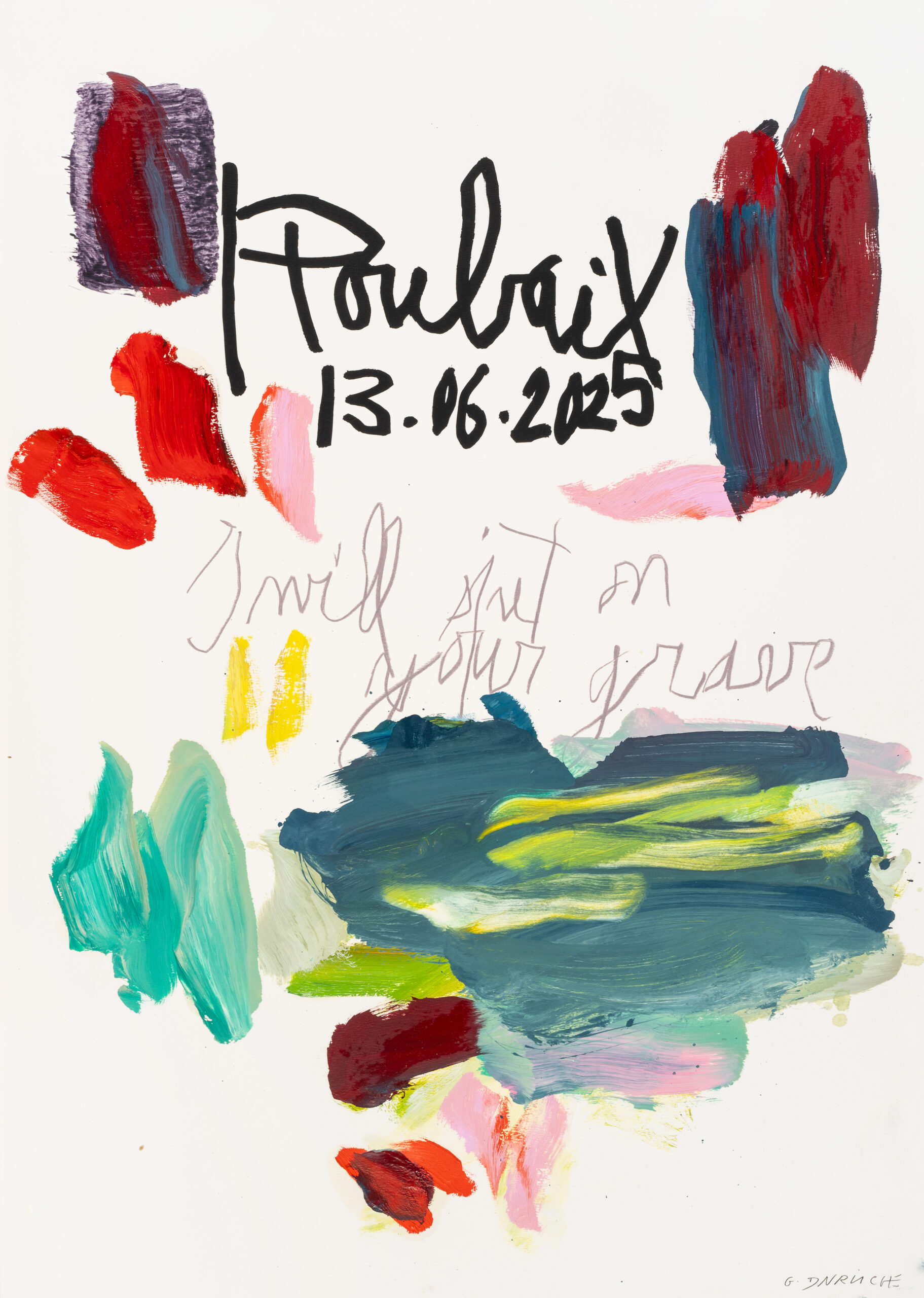 Avec cette nouvelle série sur papier, Gaël Davrinche engage une pratique à la fois intime et régulière, proche du journal. Chaque jour passé à l’atelier donne lieu à une feuille, comme la trace d’un moment précis, d’une présence. Il ne s’agit pas d’une œuvre isolée mais d’une accumulation patiente, presque obsessionnelle, où les gestes, les couleurs, les notes manuscrites et les références artistiques deviennent les indices d’un temps vécu.
